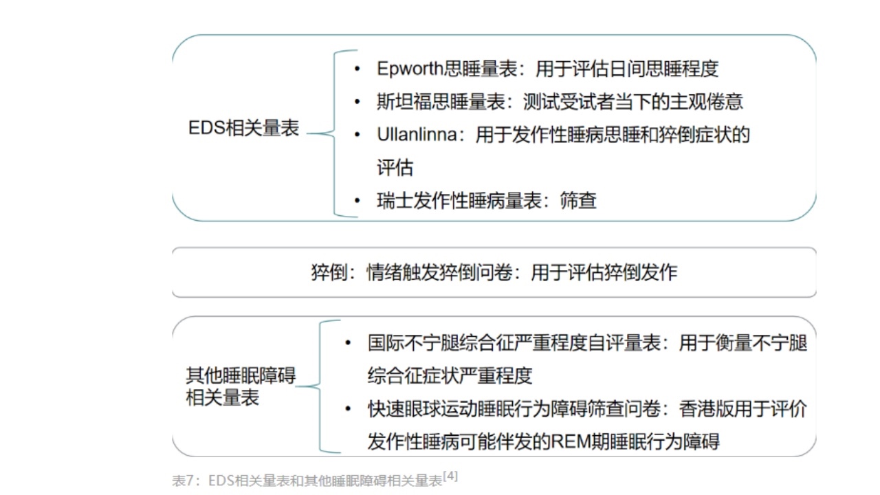对于发作性睡病患者出现的不同情况,可使用不同的量表进行检查,具体如下: