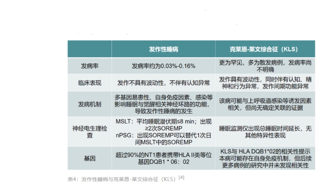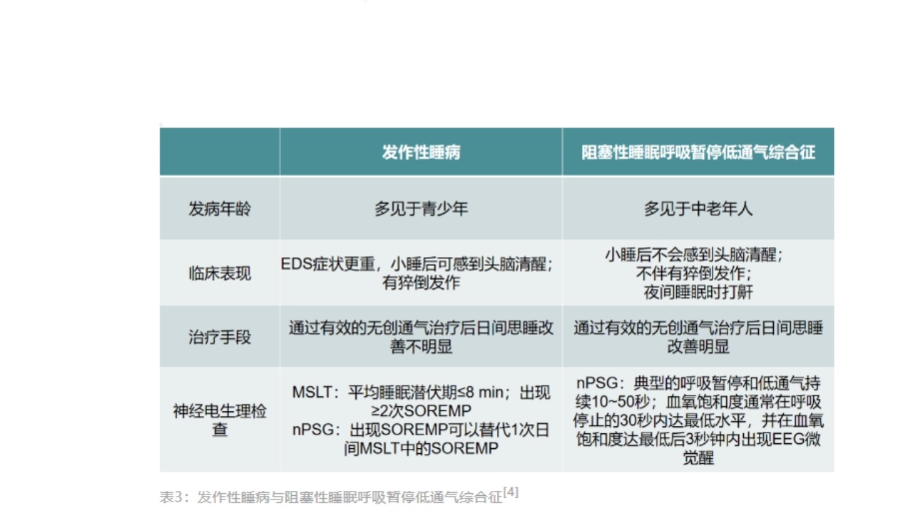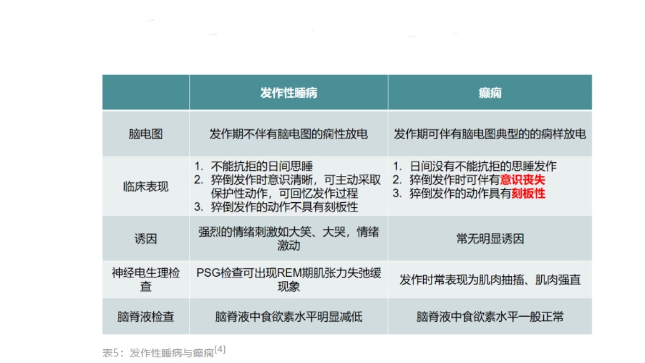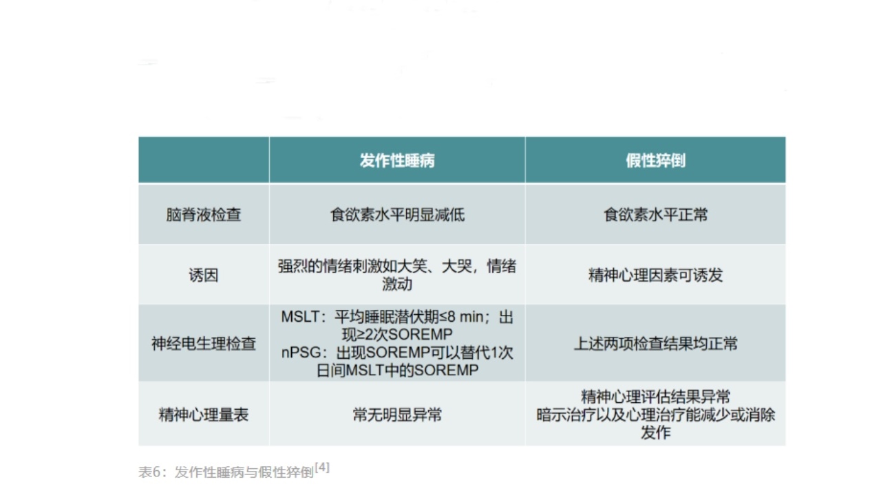 (3)精神类疾病:如不典型抑郁症、双相障碍和躯体形式障碍也可以表现EDS,但不会出现典型发作性睡病的MSLT特征和脑脊液中食欲素水平的降低。