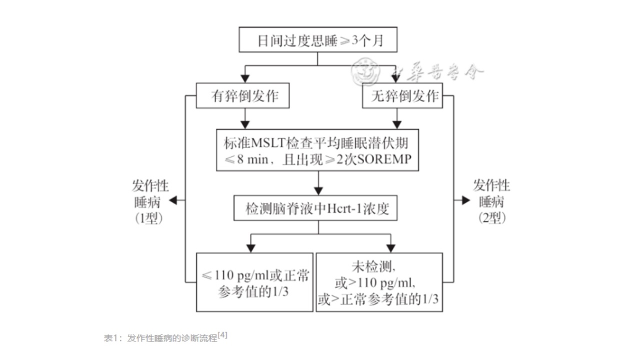 依据国际睡眠障碍分类第3版(ICSD-3),将发作性睡病分为2型。发作性睡病1型,即Hcrt缺乏综合征,既往伴有猝倒发作的发作性睡病;发作性睡病2型,既往不伴有猝倒发作的发作性睡病。发作性睡病具体诊断流程和诊断标准如下: