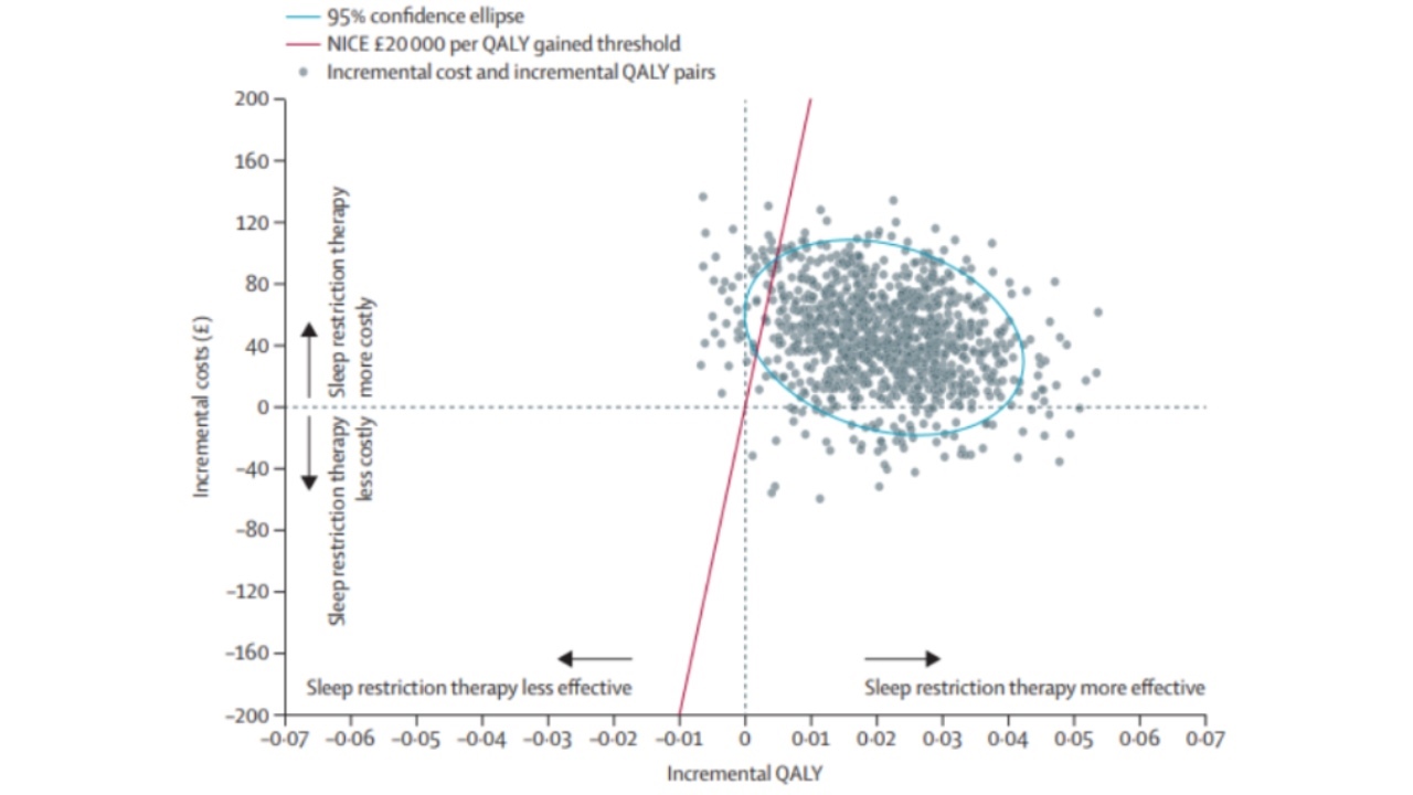 此外,研究人员还对两种治疗方法的经济效益进行了对比分析。研究人员从NICE推荐的NHS和个人社会服务(PSS)的角度进行了成本效用分析,并用每获得一个质量调整寿命(quality-adjustedlife-years,QALY)的增量成本来表示。测算结果显示每位参与者提供睡眠限制治疗的平均成本为466.8元。每个参与者睡眠限制疗法的平均培训成本为281.4元。而经过统计分析后,研究人员计算得到睡眠限制疗法具有成本效益的概率为95.3%,平均净货币效益为335412.3元。