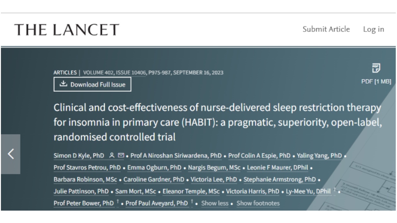 1.Kyle,SimonD.,etal."Clinicalandcost-effectivenessofnurse-deliveredsleeprestrictiontherapyforinsomniainprimarycare(HABIT):apragmatic,superiority,open-label,randomisedcontrolledtrial."TheLancet(2023).