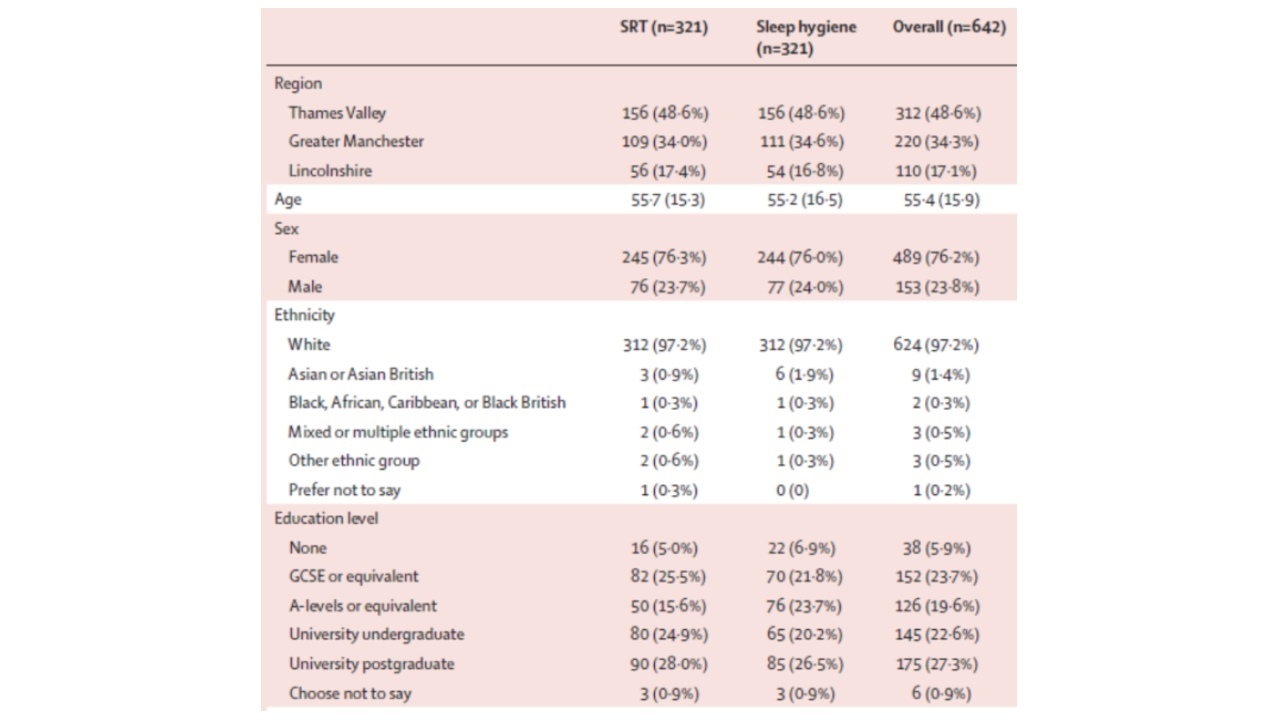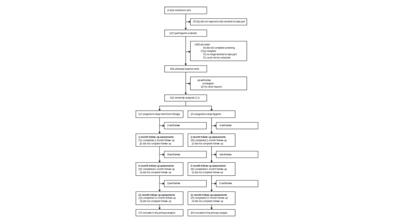 具体而言,在这项研究中,研究人员在2018年8月29日至2020年3月23日期间从英格兰三个地区(大曼彻斯特、林肯郡和泰晤士河谷)的英国国家卫生服务中心的35个全科诊所中招募了642名失眠症参与者(489名女性和153名男性),并按照1:1随机分配入两个分组:睡眠限制治疗组或睡眠卫生教育治疗组。睡眠限制治疗组参与者由经过短暂培训护士提供睡眠限制疗法,而睡眠卫生教育治疗组则通过阅读一本睡眠标志指导小册子进行教育治疗。