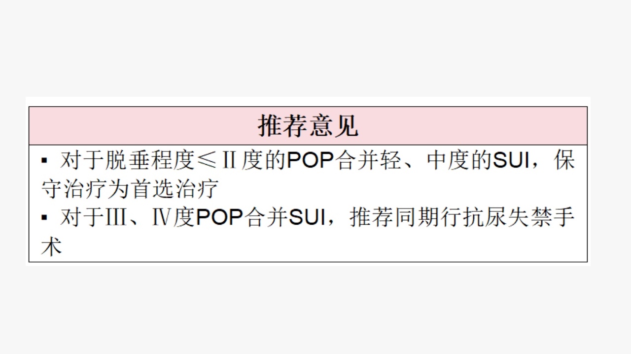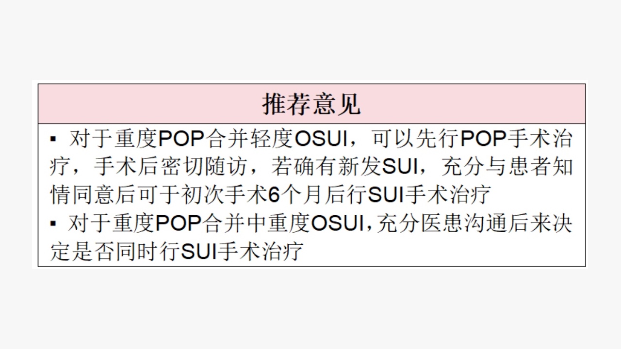 术前无确切SUI症状的POP者,先进行阴道回纳试验,若结果阴性,则无需同时行抗SUI手术;若结果为阳性,有明确SUI既往史,且随着脱垂加重而消失,或者虽无SUI既往史,但是不愿意接受二次手术的患者,可建议同时行抗SUI手术。