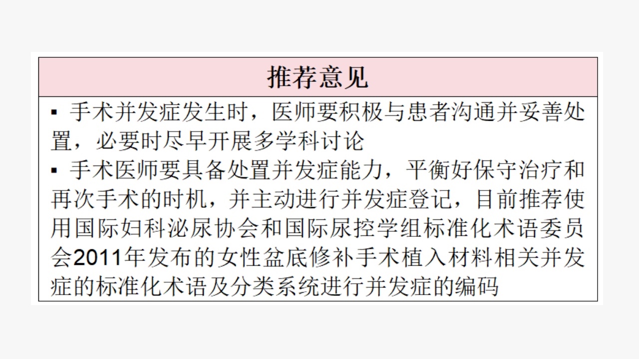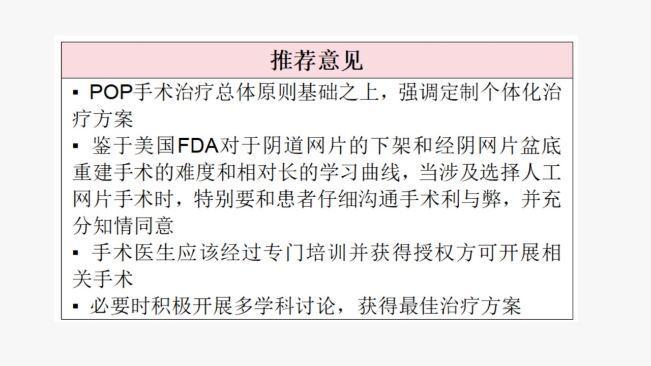 ①审慎使用人工网片或吊带,应用前仔细告知患者使用人工网片的利与弊,需要审慎使用人工网片或吊带的患者包括:长期吸烟、血管性病变、自身免疫性疾病患者;具有严重合并症不能耐受大范围、长时间手术者。