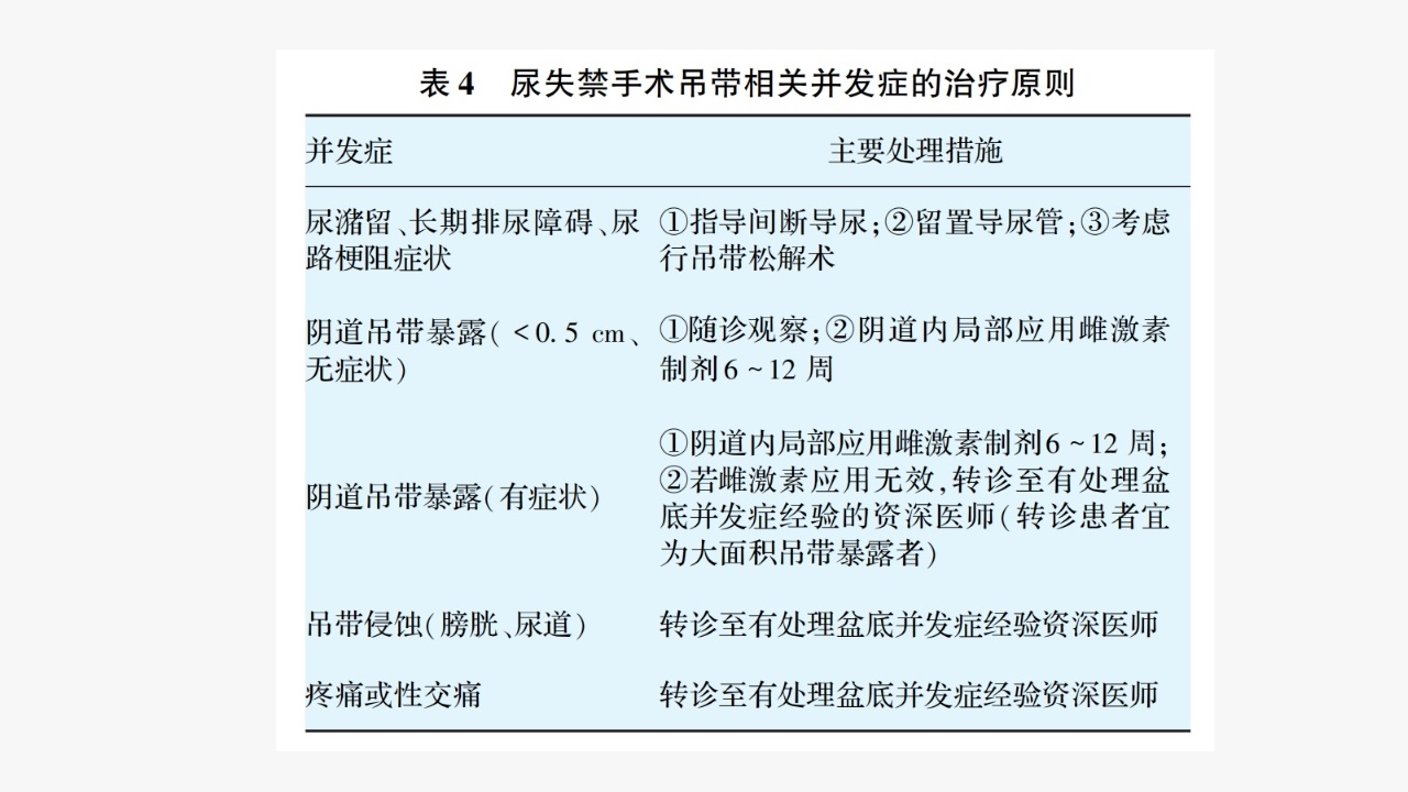 2、尿失禁手术吊带相关并发症的处理治疗原则,见表4。