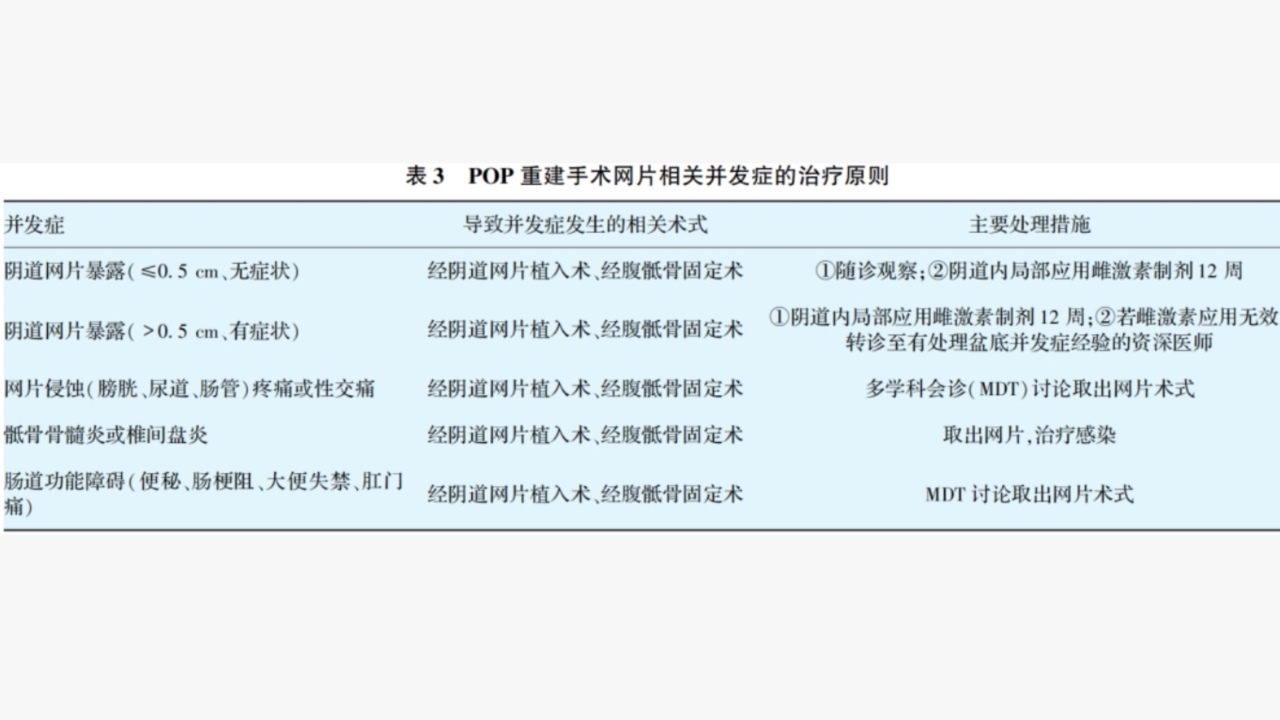 ④POP重建手术网片相关并发症治疗原则,见表3。