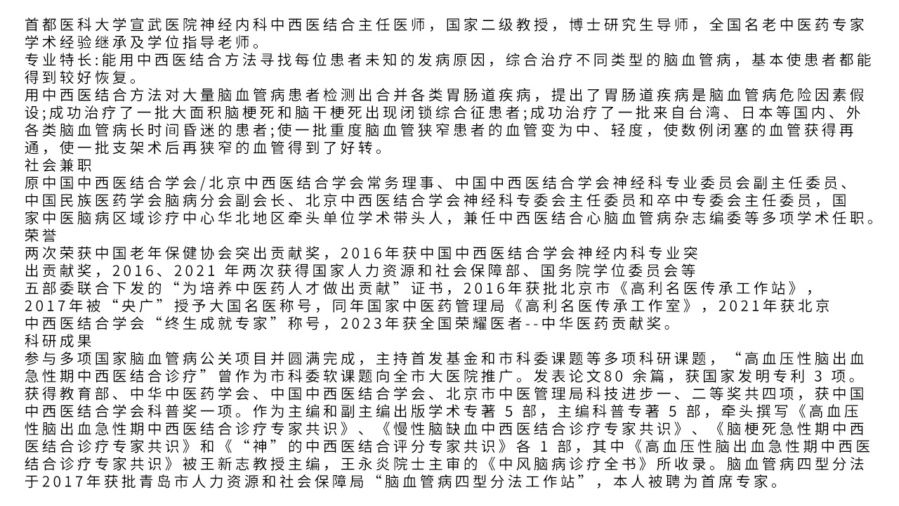 本人具有中西医双重文凭,所带领的团队对脑血管病中西医结合诊疗与分型施治,均源于长期的临床实践、经验积累与总结,并非拘泥于既有学术观点推演,亦非照搬教科书的固化思路,而是以临床问题为导向、以患者证候表现及实际疗效为核心的实践成果。作为临床医师,“解决患者病痛、改善临床预后”是我们的核心定位与初心,基于大量真实病例的实践验证,我们坚信这套建立在扎实的理论、实验依据、临床数据基础上的诊疗体系具有可靠的应用价值,能够经得住实践的进一步检验。